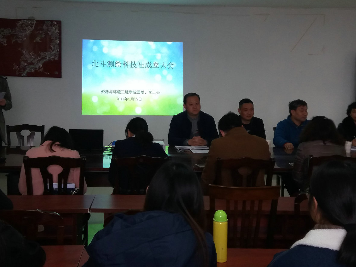 3月15日下午,资源与环境工程学院北斗测绘科技社成立大会在图书馆804会议室举行。扬州易图地理信息科技股份有限公司行政副总经理胡宏春、扬州市软件行业协会常务副会长孙华峰作为校外特聘顾问参加了会议,学院党总支李爽书记、王海玫副院长、测绘规划系王丹主任和社团全体指导教师出席了会议,大会由院学生会主席、社团首任社长袁金龙同学主持。