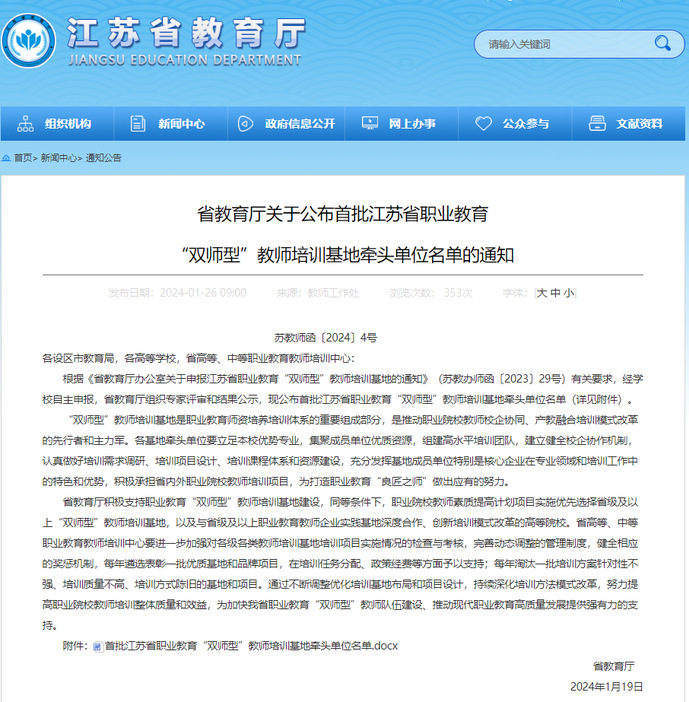 近日,根据《省教育厅办公室关于申报江苏省职业教育“双师型”教师培训基地的通知》(苏教办师函〔2023〕29号)有关要求,经学校自主申报,省教育厅组织专家评审和结果公示,我校被评为首批江苏省职业教育“双师型”教师培训基地牵头单位(资源环境与安全大类)。