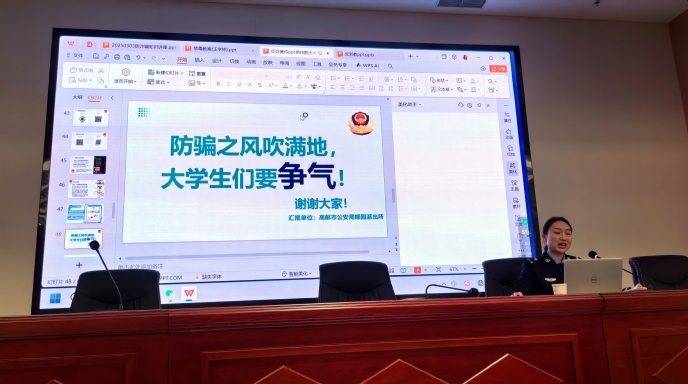 王学栋给大家讲解了禁毒知识,新型毒品的特点等,通过真实案例提醒同学们要珍爱生命,远离毒品。陈慧如通过同学们身边的案例介绍了常见的电信网络诈骗手段,教给大家防骗的方法:不听、不信、不转账、不共享屏幕等。陈警官还通过短视频向同学们介绍了**的发展历史及其社会危害性,希望同学们崇尚科学,反对**。